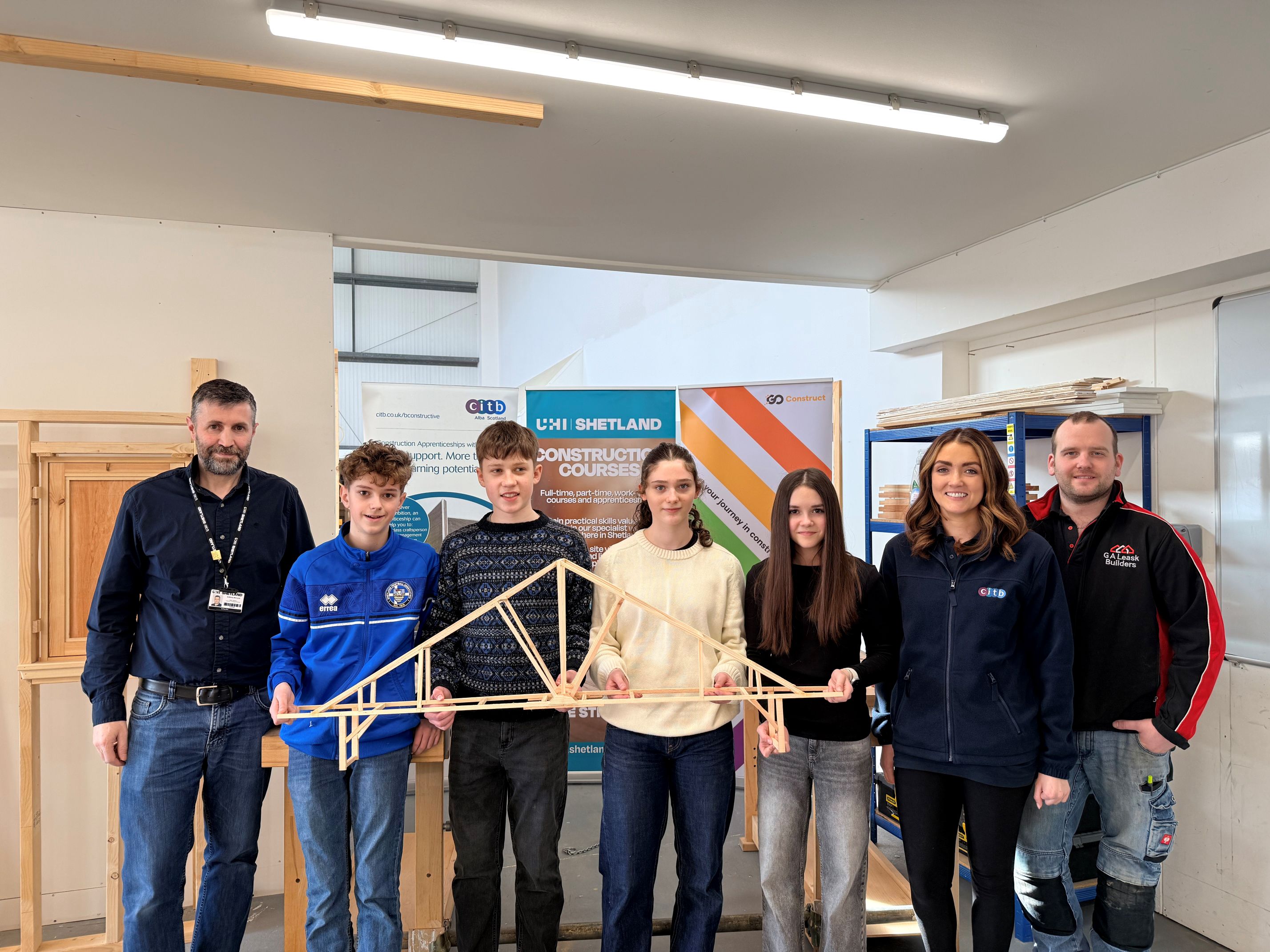 A partnership between UHI Shetland, Shetland Construction Training Group and CITB invited young people to join in a day of literal Bridge Building; with the young people working in teams to construct bridges out of wood, in the pursuit of three prizes: Overall Winner, Best Teamwork and Best-looking Bridge.